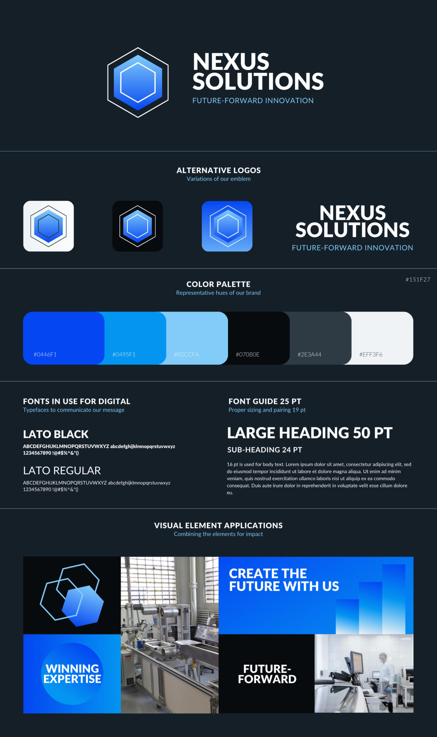 Nexus Solutions, the company I made-up, is a manufacturing company in the midst of pivoting from heavy machinery to technology. Manufacturers tend to prefer simple, clean fonts like Arial. To set them apart, Lato was used. Its sans serif nature combined with plenty of weights lends itself to being used for headings, subheadings, and body text. To indicate the company's desire to pivot, blue was used.I designed the logo by considering what shapes in manufacturing and STEM. In this instance, I was inspired by the similar shapes of cogs and aromatic chemicals.