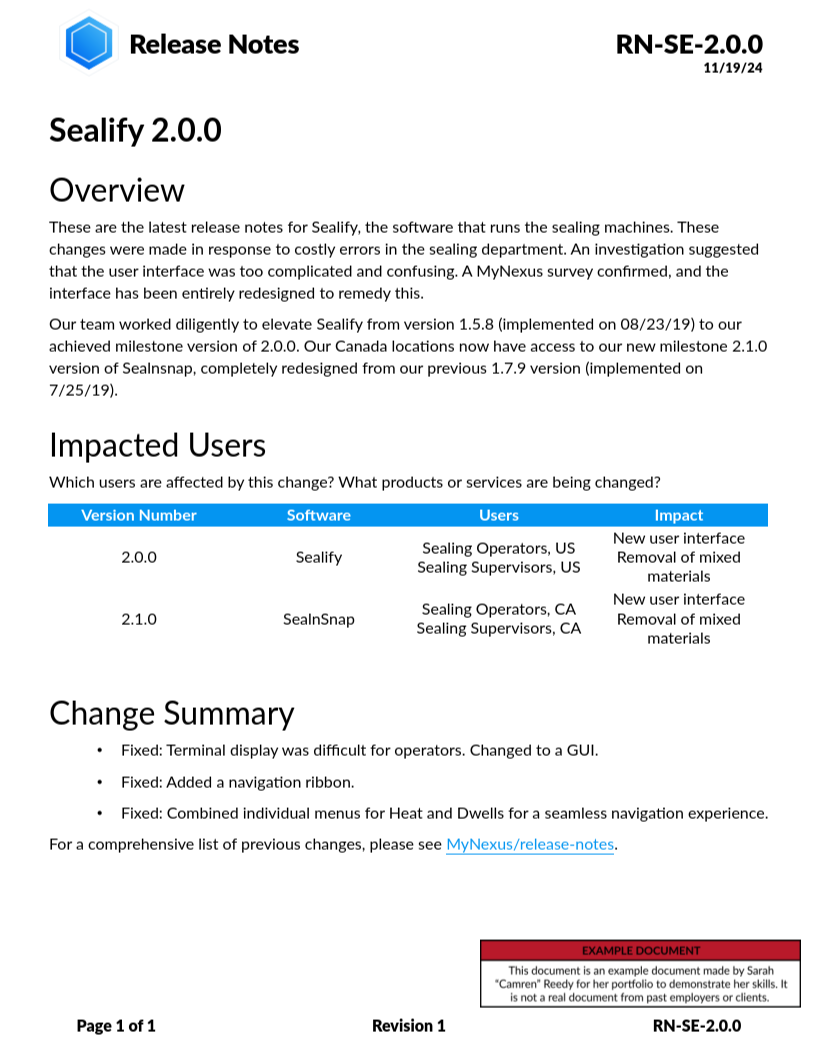 Technical writers often create documents critical to the life and wellbeing of a company. Marketing materials, service manuals, compliance and quality documents, etc. It is understandable for prospective employers to want to see proof of ability before hiring an employee. Portfolios are common and expected.However, NDA’s pose an issue. How does one demonstrate their abilities while also respecting a legal agreement to not distribute proprietary information?I’ve approached this by creating Nexus Solutions. Nexus Solutions is a made-up company and does not exist. I've created documents that demonstrate my knowledge and skills without revealing proprietary information. Nexus Solutions is a manufacturing company that's pivoting into technology and the future.